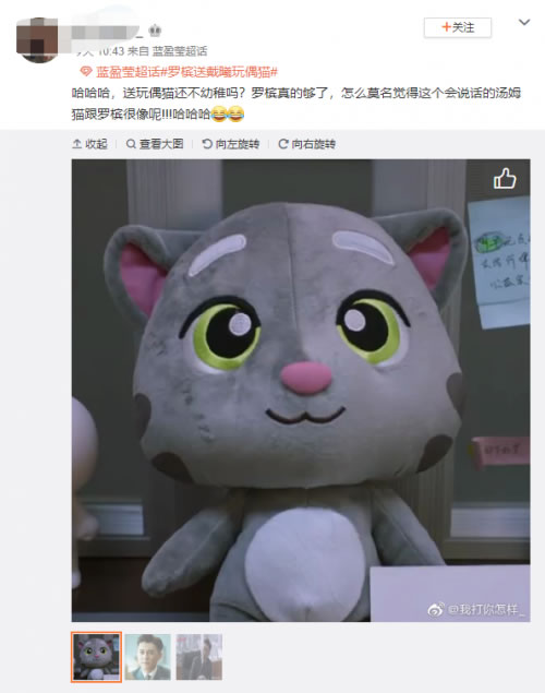 原来罗大律师送的礼物正是会说话的汤姆猫周边娃娃。这个汤姆猫可大有来头,早在十年前就已经风靡全世界了,如今这个IP的游戏全球下载量超过100亿次,覆盖全世界超200余个国家和地区。汤姆猫是个男女老少皆通吃的猫咪先生,魅力指数和罗大律师有得一拼!