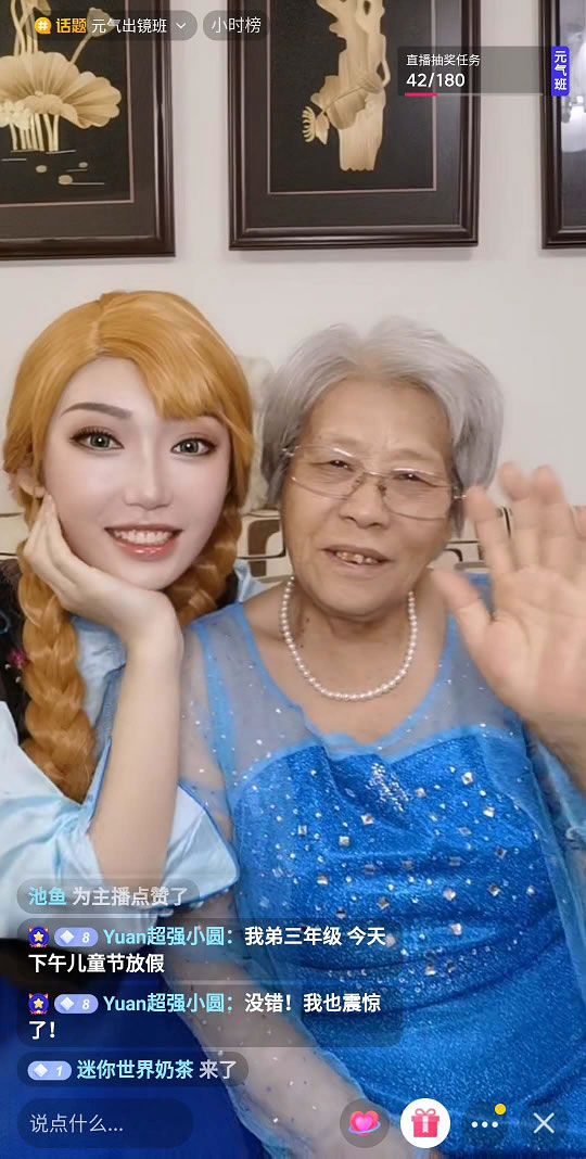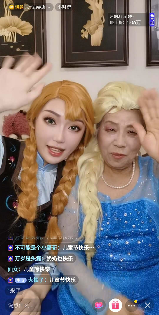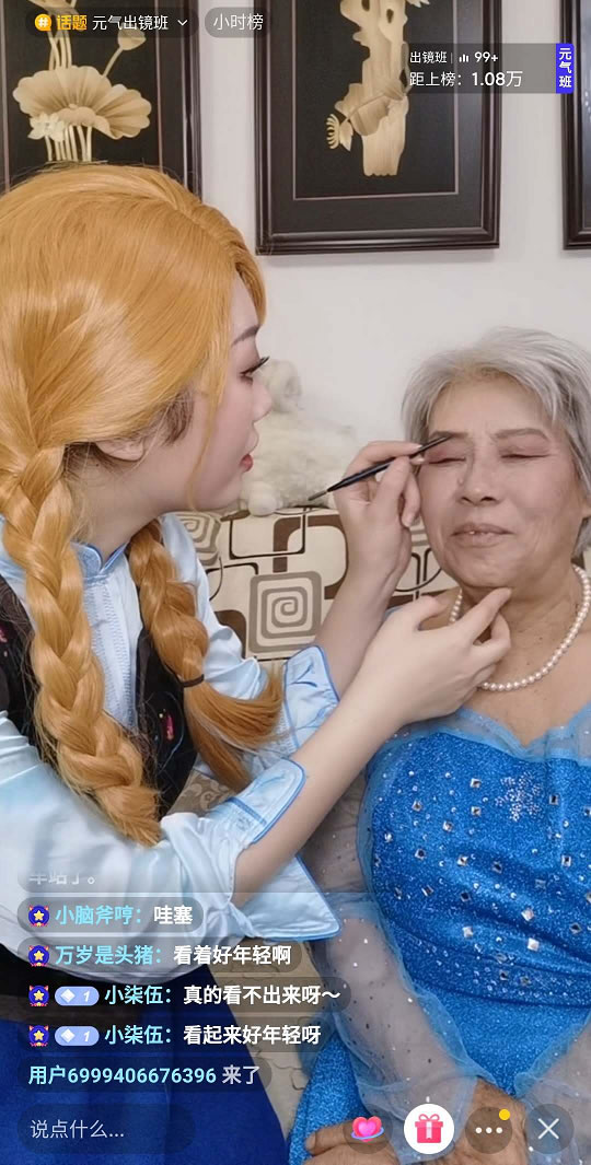 6月1日下午1点,心台以安娜公主的形象开启了直播,她头戴假发,身穿安娜角色服;奶奶一头银发,和蔼可亲,蓝色连衣长裙晶莹亮丽、气质有加,完全看不出是将近80岁的老人,面对直播间惊讶的弹幕,奶奶解释道:“这么大岁数还能这么健康,主要是心态好。”心台也说奶奶是位特别有童心、能跟得上潮流的老太太。而后,心台便开启了化妆挑战,给奶奶化起了“冰雪女王”艾莎的仿妆,通过直播里两人的交谈,我们也对这位童心未泯的奶奶有了更多的了解。