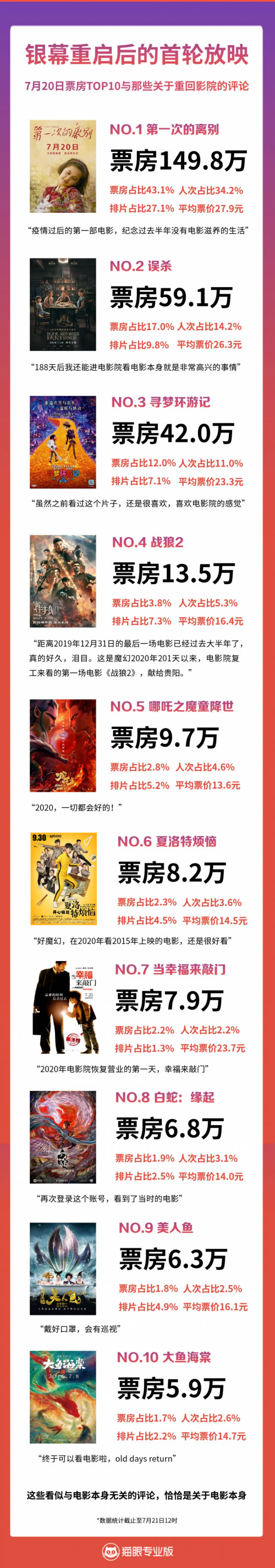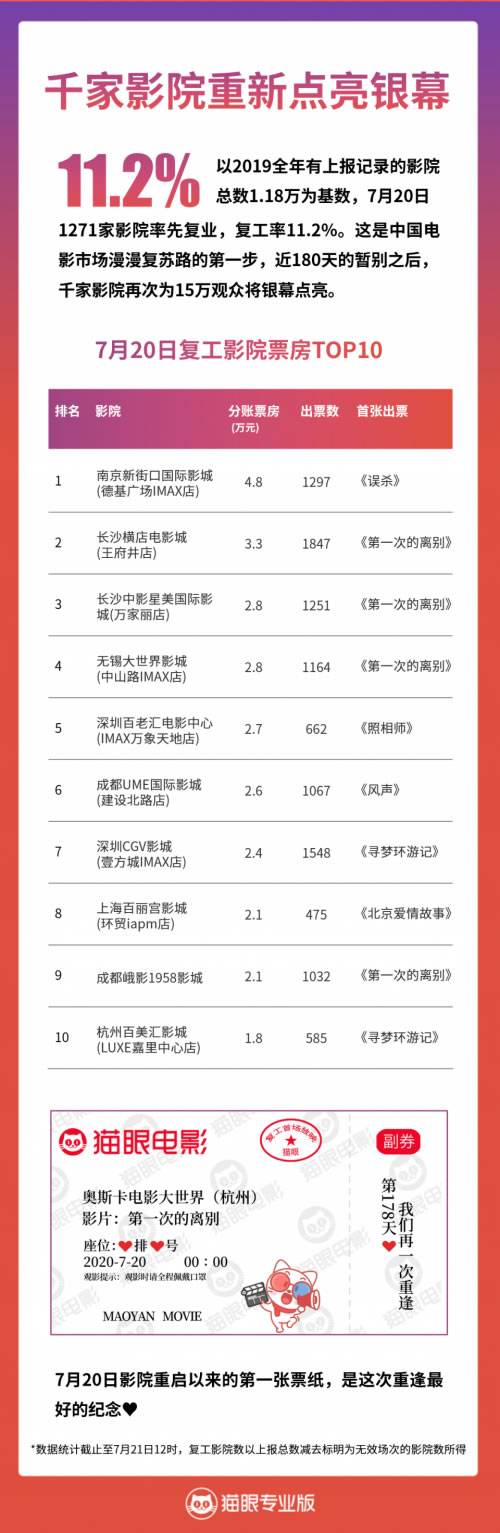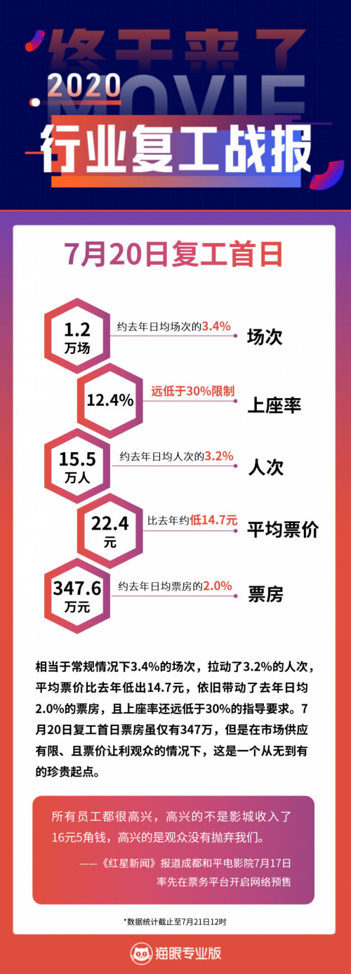 7月21日,猫眼专业版发布行业复工首日战报数据,7月20日复工首日全国票房347.6万元收官。