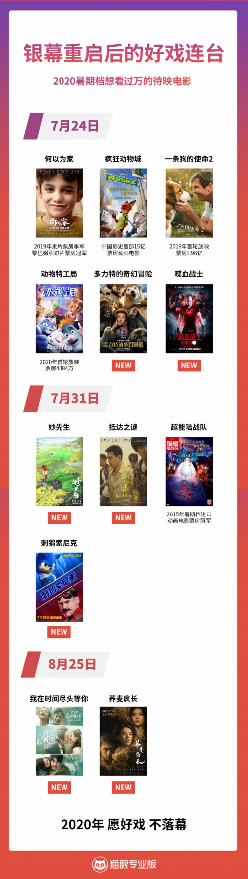 随着行业继续有序复苏,2020年仍将迎来更多电影定档,用更好的内容再次吸引观众走进影院。行业复工首日,在影片、影院供应初启之下,每一个数字都是这场全民抗疫之战的结果,也是2020电影市场从无到有的珍贵起点。这个夏天,依旧值得我们期待。
