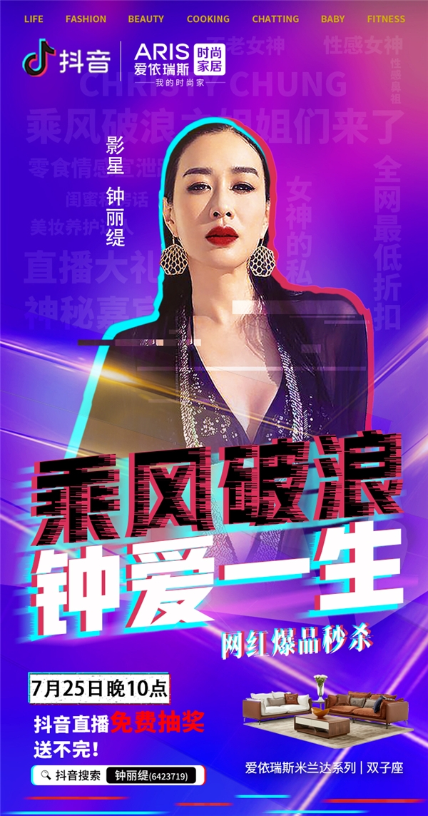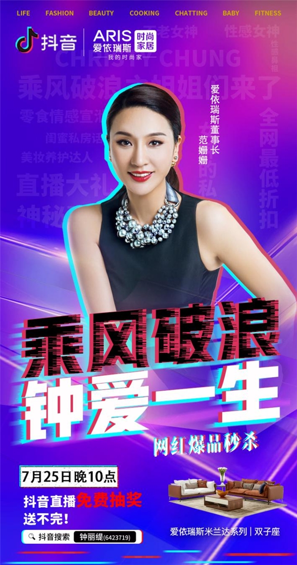7月25日,“姐姐”钟丽缇将携手爱依瑞斯董事长范姗姗开启一场“乘风破浪”的直播,以爱和时尚打造“钟爱一生”家居范儿。