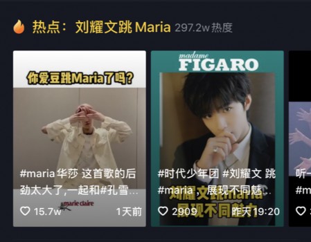 7月份下旬,刘耀文在抖音上模仿《Maria》的视频于抖音登上热搜榜,伴随歌声响起,这段舞蹈视频及其抖音衍生产出达到700多万的热度,也让他作为年轻艺人,知名度在核心粉圈外进一步扩散。