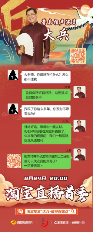 近日,相声演员大兵宣布自己将入驻淘宝进行带货直播,并将于8月24日晚8点开启淘宝直播首秀。大兵作为南派相声的代表人物,又是湖南家喻户晓的笑星大咖,接地气又充满亲和力的形象深受全国人民喜爱。此次入驻淘宝直播,也是大兵想打破屏幕之间的距离,将与全国各地粉丝互动的机会提到线上来,与粉丝能够更近距离的沟通,为粉丝带来货真价实的好物分享。