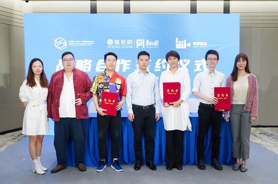 在吕靖、曹秋石、黄政文、段晶晶的共同见证下,凤凰互娱版权中心总经理肖雨辰与中传悦众平台部经理李天娇、阿部影业薛博签署战略合作协议。