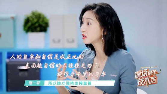 唐一菲认为“人的自卑和自信是成正比的,表面越自信的人往往是为了掩饰骨子里的自卑”。唐一菲认为张玮像一个装在套子里的人,她想与世界保持距离,出于想要自我保护,就把自己变成了一个刺猬,由于带娃之后又回到职场,她的紧张和自卑带来的这种刺,所以我挺心疼她的。